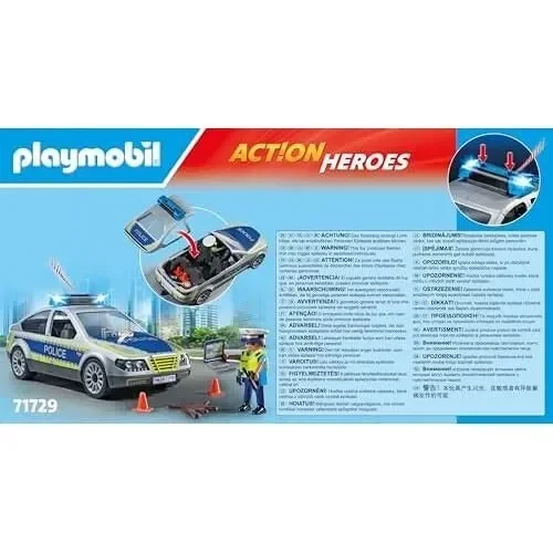 Ce coffret Playmobil met en scène une intervention policière réaliste avec un véhicule de patrouille équipé d’un module lumineux et sonore amovible (2 sons de sirène, lumière clignotante, arrêt automatique). Le toit du véhicule est amovible pour permettre l’installation de jusqu’à 4 figurines à l’intérieur.