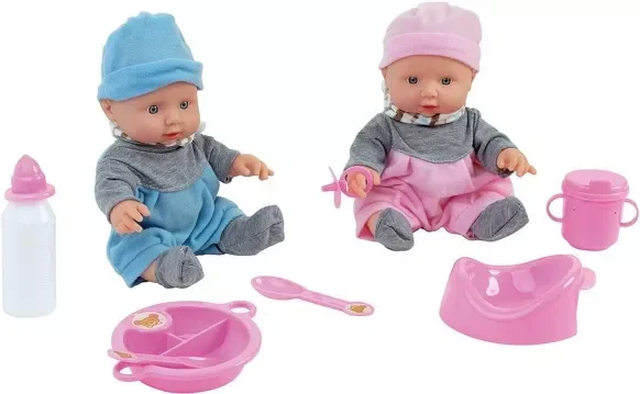 Prends soin de tes jumeaux : nourris-les, chouchoute-les, pose-les sur le pot. Appuie sur leur ventre : ils rigolent, parlent et pleurent, comme de vrais bébés. Poupons de 25 cm.Inclus 7 accessoires. 6 sons.