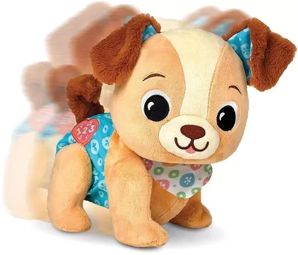 La peluche avance seule et marche sur ses 4 pattes comme un vrai chien pour stimuler la curiosité et la motricité de Bébé. 1 bouton coeur interactif lumineux encourage l'enfant à le suivre, à compter ses pas et déclenche des chansons et des mélodies. La queue de Toutou s'anime !