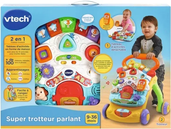 Super trotteur parlant 2 en 1 (orange) - 9 - 36 mois - 2 en 1 : trotteur et tableau d’éveil parlant et musical détachable. Bébé découvre les mots, les chiffres, les formes, les animaux et les couleurs. Le capteur de mouvement déclenche de joyeuses mélodies et encourage Bébé dans ses déplacements. Le tableau d’activités détachable permet à Bébé de jouer où il veut ! Téléphone d’imitation inclus. 10 activités pour éveiller bébé et + de 100 chansons, mélodies, sons et phrases. Système de freinage pour contrôler la vitesse et accompagner Bébé en douceur dans ses premiers pas ! Aide bébé à développer sa motricité, son langage, sa coordination et à faire de nombreuses découvertes. Facile à ranger grâce à son système de pliage. Plus de 100 chansons, mélodies, sons et phrases. Volume sonore réglable.