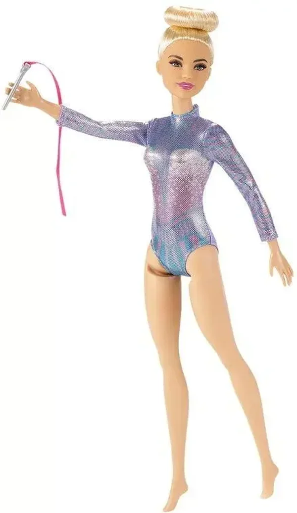 - Cette poupée Barbie® gymnaste (30,4 cm) porte un justaucorps de couleur métallisée et a un joli chignon haut. Elle est fournie avec deux massues et un ruban qu'elle peut tenir en main en faisant des figures. Les enfants vont adorer les possibilités infinies de création et d'expression qu'offre ce coffret.