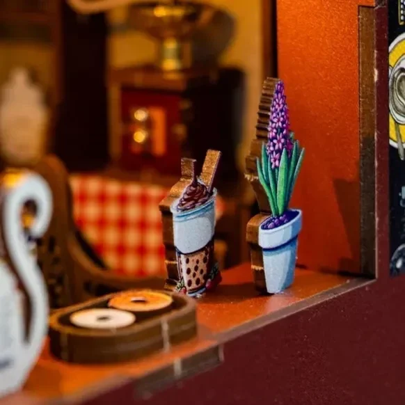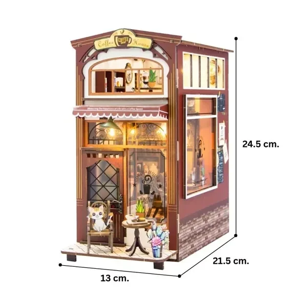 Modèle : Book Nook - Maison du CaféMéthode : Book NookTaille : 24,5 x 21,5 x 13 cmNombre de pièces : 62Temps de montage estimé : 9 à 15 heuresNiveau de difficulté : ★★★☆☆ (3 sur 5) Qu'est-ce qu'un Book Nook ? Un Book Nook est un projet de diorama miniature à faire soi-même conçu pour s'insérer entre les livres sur une étagère. Ces charmants kits DIY vous permettent de créer une petite scène détaillée qui ajoute une touche de magie et de fantaisie à votre bibliothèque ou à n'importe quelle pièce de votre maison. Parfait pour les amoureux des livres, les passionnés de modèles réduits et tous ceux qui apprécient les projets créatifs, les Book Nooks transforment votre espace en une fenêtre vers un autre monde. À propos de ce Book Nook Ce kit de Book Nook contient tous les matériaux nécessaires pour commencer et créer votre monde miniature : Pièces en bois : Pré-découpées et faciles à assembler LED : Pour donner vie à votre scène Boîte à piles et fils : Pour une installation facile des LED Accessoires miniatures : Divers petits objets pour améliorer le réalisme Accessoires en papier : Pour ajouter des éléments détaillés à votre scène Composants : Toutes les pièces nécessaires pour créer un Book Nook détaillé et complexe Manuel d'instructions : Guide détaillé, étape par étape Photo miniature : Une image de référence pour vous guider tout au long du processus Maison du Café Pénétrez dans la chaleur de la Maison du Café en bois, un café miniature qui capture le charme des après-midis douillets et l'arôme du café fraîchement préparé. La devanture accueillante s'ouvre sur un intérieur de café confortable, avec des chaises élégantes, des nappes à motifs et des étagères garnies de pâtisseries, de grains de café et de bouteilles. De petits détails comme un moulin vintage, des tasses à café et des fleurs fraîches créent une atmosphère de confort et de détente. À l'extérieur, une petite table avec des douceurs et un chat joueur ajoute une touche de convivialité, en faisant le coin parfait pour imaginer un goûter. Pourquoi vous allez l'adorer Créatif et amusant : Profitez d'un projet manuel relaxant. Ambiance charmante : Apportez la sensation chaleureuse d'un café de quartier à votre étagère. Cadeau parfait : Idéal pour les amoureux des livres, les passionnés de café et les maquettistes. Le produit nécessite 2 piles AAA. En raison de la politique douanière, la colle et les piles peuvent ne pas être incluses dans le colis.